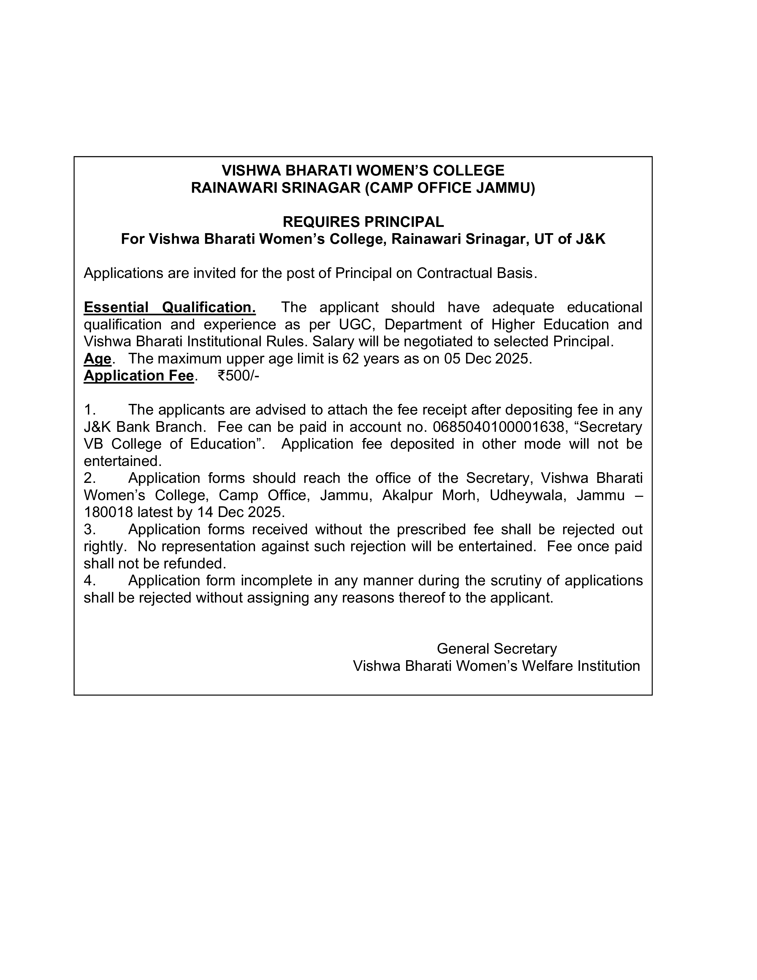 ADVERTISEMENT NOTICE FOR THE POST OF PRINCIPAL FOR V.B WOMEN'S COLLEGE RAINAWARI SRINAGAR KASHMIR